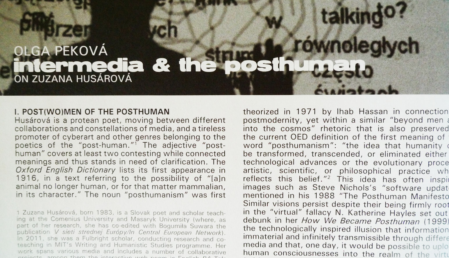 “With her (inter)media nomadism, Husárová is an important figure of an emerging wave of central European media poets now in their thirties (other names including Jorg Piringer, Katarzyna Gielzynska, Lukasz Podgórni, Leszek Onak). The playful, “chameleonic” nature of Husárová’s work is not just a symptom of her personal inquisitiveness, but makes perfect sense within the context of the broader cultural transition toward posthumanism, which brings with it the need to inspect the relations and dialogues between different media, as well as the possibilities of a multisenzoric, synaesthetic experience. The body is examined not only explicitly, as a topic, but also implicitly, as the crossroads of media inputs with their various kinds of materiality; on the other side of the screen, an image of technological synaesthesia is gradually being constructed, highlighting the inherency of such efforts in the concept of the post-human (as exemplified by Vannevar Bush’s writing). Yet the digital text also reflects back on the book whose “diagrammatic” possibilities are explored in the interaction of different media during the live performances – in this, Husárová’s concerns parallel Amaranth Borsuk´s in Between Page and Screen. Last but not least, Husárová’s dialogue with the American scene signals the emergence of a broader community of new media artists.” Olga Peková: Intermedia & The Posthuman: On Zuzana Husárová. In VLAK 2013, s. 388-391. >>>